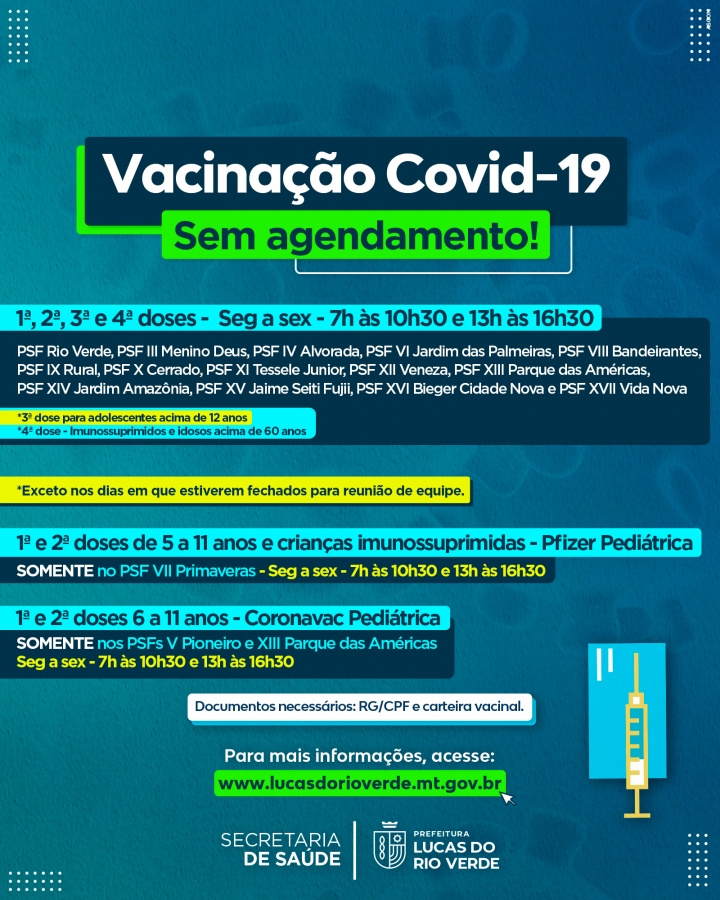 Importante destacar que, para crianças de 6 a 11 anos, a vacina Coronavac pediátrica também passa a ser aplicada no PSF XIII Parque das Américas, além do PSF V Pioneiro, com sala de vacinas atendendo das 7h às 10h30 e 13h às 16h30, de segunda a sexta.