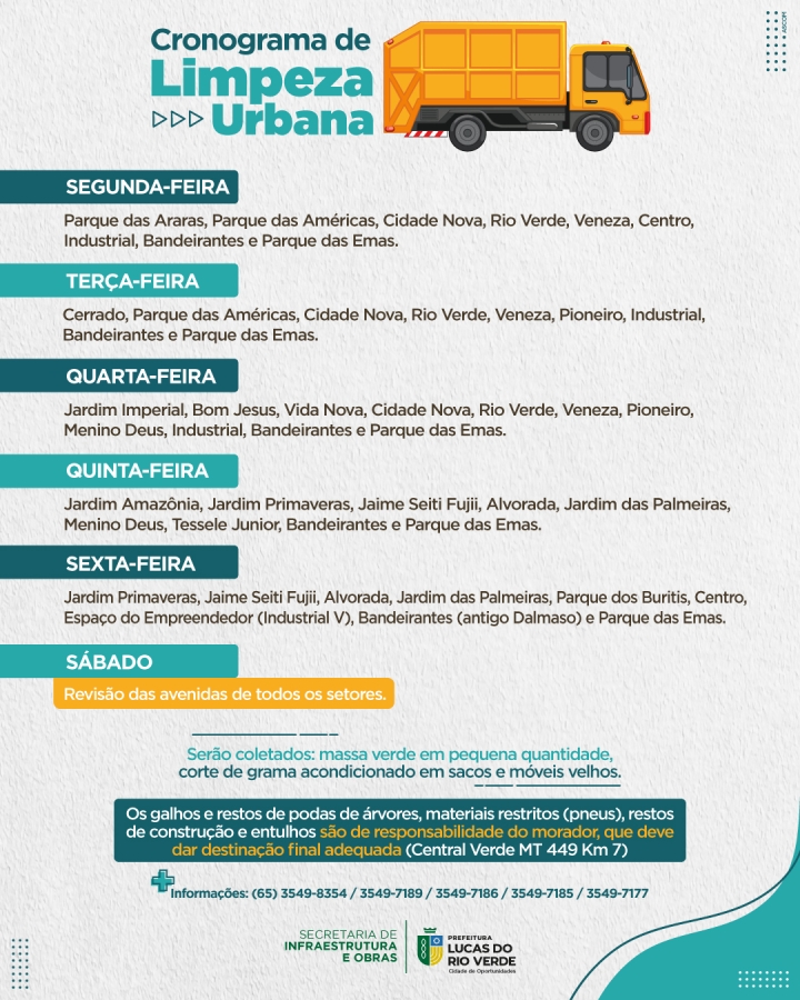 Confira abaixo o cronograma de limpeza urbana: