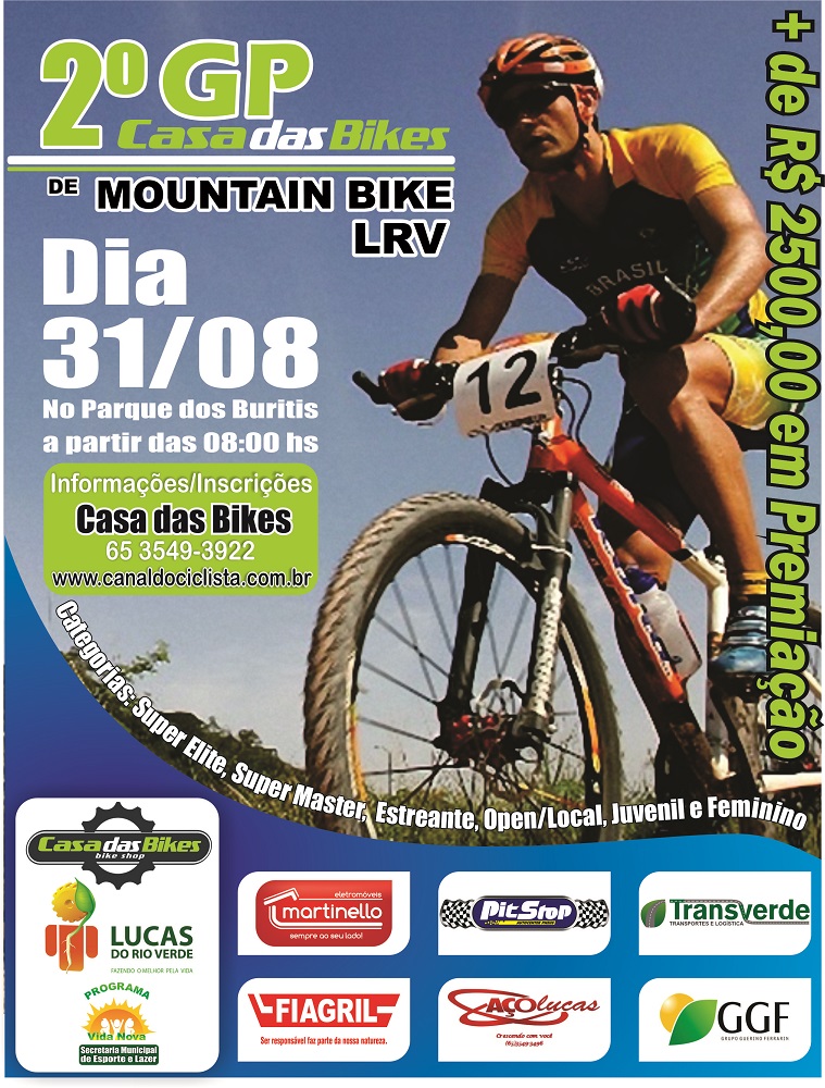 O Programa Vida Nova em parceria com a Casa das Bikes realiza o 2º GP Casa das Bikes de Mountain Bike de Lucas do Rio Verde. O evento será realizado no domingo (31) com início às 08h00, no Parque dos Buritis. Podem participar do GP atletas profissionais da região e amadores, acima de 11 anos. Os menores de idade devem estar acompanhados pelo responsável.