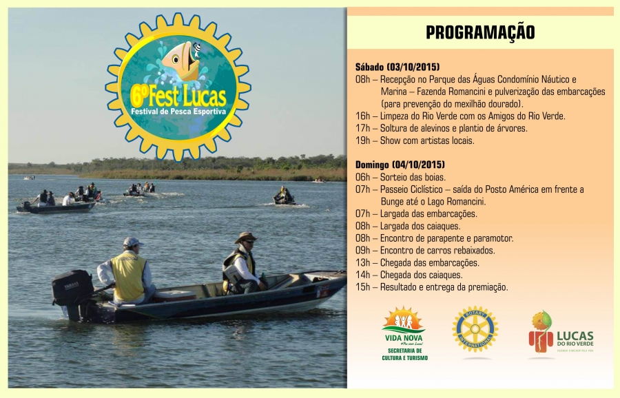 A 6ª edição do Festlucas e o 1º Festival de Pesca com Caiaques serão realizados nos dias 3 e 4 de outubro, no Parque das Águas Condomínio Náutico e Marina – Fazenda Romancini, localizado na rodovia MT 449 km 23.