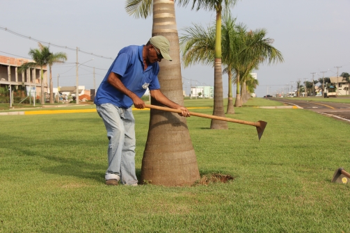 Os servidores de jardinagem que participaram de capacitação põem em prática o aprendizado para coroamento de plantas.