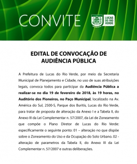 A audiência será realizada dia 19, às 19 horas, no auditório do Paço Municipal