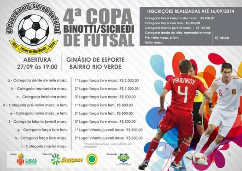 A Liga Esportiva Luverdense, em parceria com a Prefeitura de Lucas do Rio Verde, Sicredi Ouro Verde e Binotti Armazéns Gerais, realizará a 4ª Copa Binotti Sicredi de Futsal. A abertura será neste sábado, dia 27 de setembro, às 19h, no Ginásio Rio Verde.