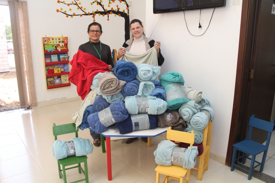 Na última tarde, a primeira-dama Rafaela Frizzo e a secretária-adjunta da Secretaria de Assistência Social e Habitação, Adriana Bonicontro, estiveram entregando cobertores e roupas para instituições e famílias referenciadas pelo Cras.