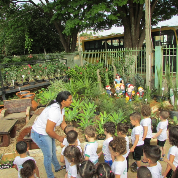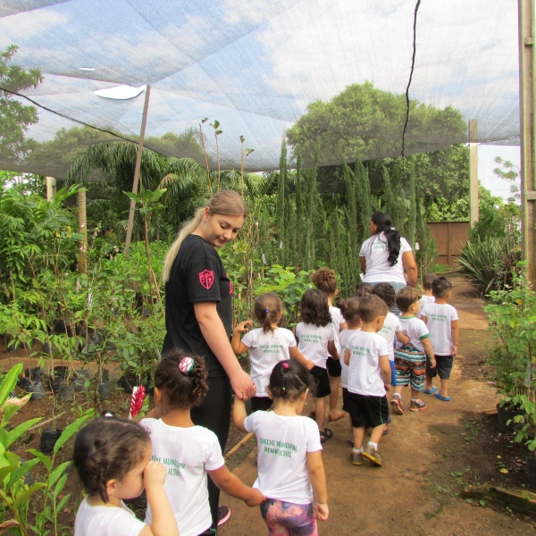 Durante o passeio as crianças conheceram exemplares de plantas frutíferas, ornamentais e espécies nativas. A professora Juliana e as monitoras utilizaram o passeio para ensinar as crianças a respeito dos cuidados com as plantas e da importância para o meio ambiente e alimentação.