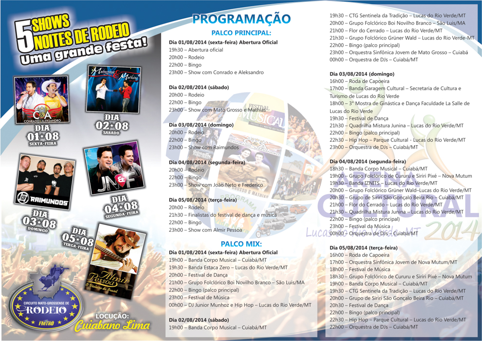 Os grupos de Cururu e Siriri Pixé de Nova Mutum e o São Gonçalo Beira Rio de Cuiabá. Também da capital virão a Orquestra de DJs e a Orquestra Sinfônica Jovem de Mato Grosso. Também está na programação a vinda da Orquestra Jovem de Nova Mutum.