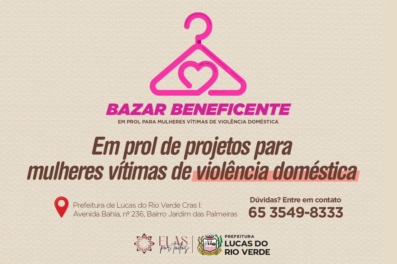 A Secretaria de Assistência Social e Habitação de Lucas do Rio Verde está organizando um bazar beneficente com um propósito especial: toda a arrecadação será destinada ao apoio a mulheres vítimas de violência em Lucas do Rio Verde.