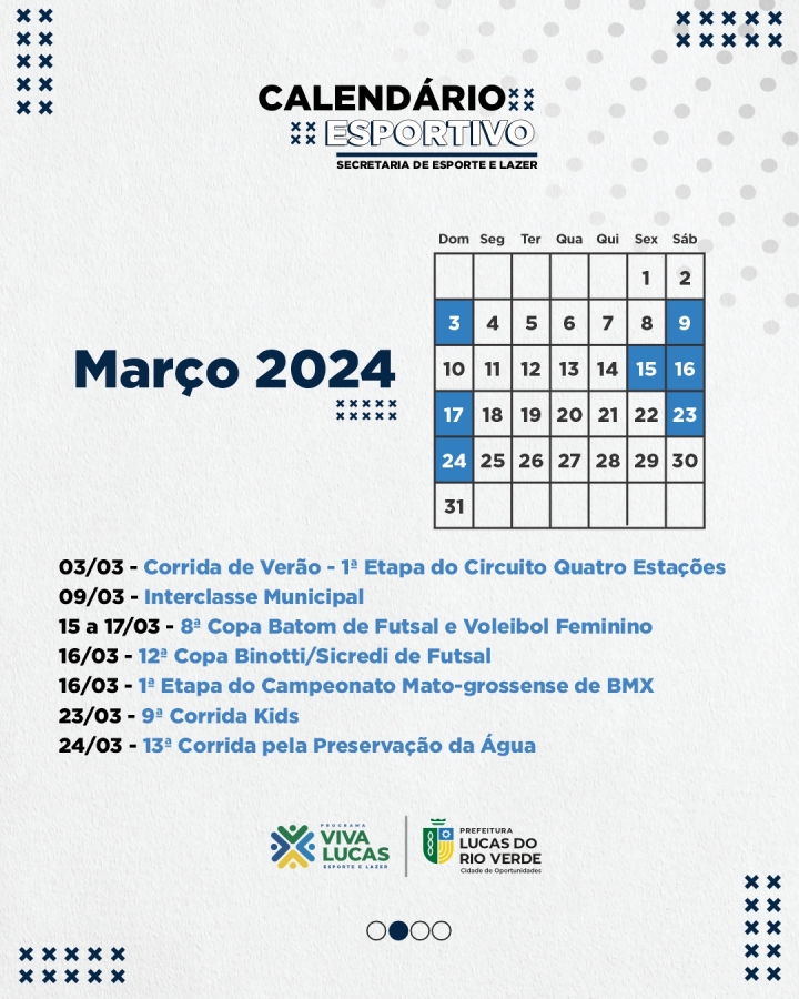 Em março, 11 eventos estão na programados, sendo: Corrida de Verão – 1ª etapa do circuito Quatro Estações (03/03), Interclasse Municipal (09/03), 8ª Copa Batom de Futsal e Voleibol Feminino (15 a 17/03), 12ª Copa Binotti/Sicredi de Futsal (16/03), 1ª etapa do Campeonato Mato-grossense de BMX (16/03), 9ª Corrida Kids (23/03) e 13ª Corrida pela Preservação da Água (24/03).