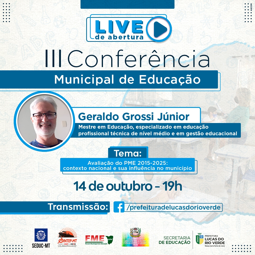 Dando continuidade às etapas que iniciaram em setembro, a Secretaria de Educação de Lucas do Rio Verde realizará, em 14 de outubro, uma live da Conferência Municipal de Educação. A transmissão será realizada através do Facebook da Prefeitura www.facebook.com/prefeituradelucasdorioverde/, às 19h.