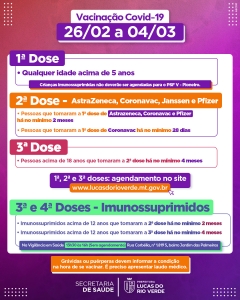 A Secretaria de Saúde de Lucas do Rio Verde informa como será o esquema de vacinação contra a Covid-19 para os próximos dias, de 26 de fevereiro a 04 de março, incluindo fim de semana e também a programação de quarta a sexta-feira. Na segunda e terça será ponto facultativo e não terá vacinação.