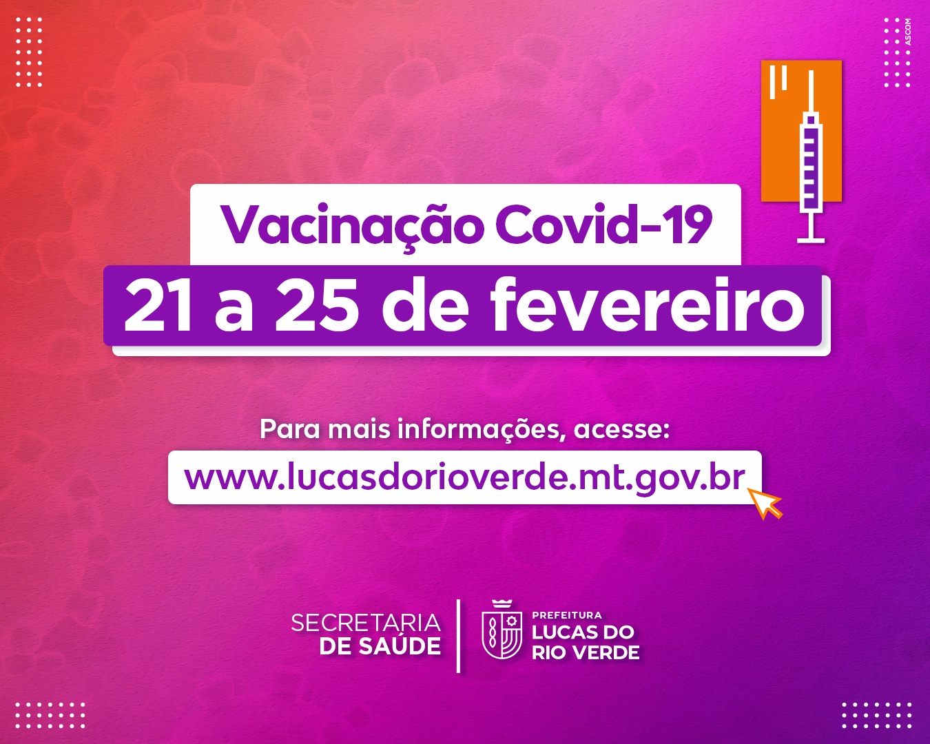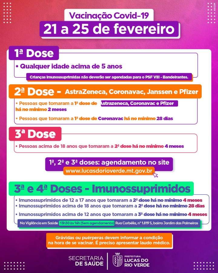 A Secretaria de Saúde de Lucas do Rio Verde informa como será o esquema de vacinação contra a Covid-19 para a próxima semana, de 21 a 25 de fevereiro (segunda a sexta-feira).