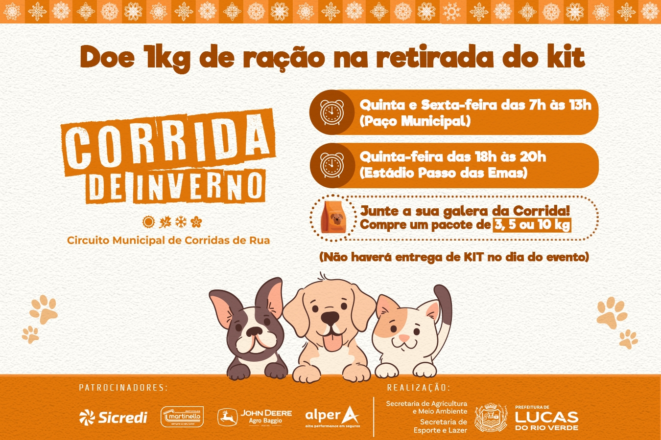 Não haverá cobrança de taxa de inscrição, apesar disso, o atleta pode contribuir com a causa animal, entregando 1 kg de ração para cães ou gatos no momento da retirada do kit.
