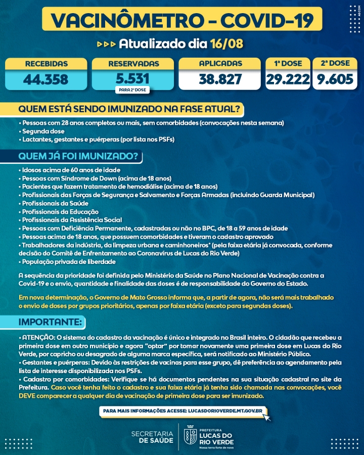 O Município de Lucas do Rio Verde informa a todos os cidadãos que, na atual fase, estão sendo imunizados: