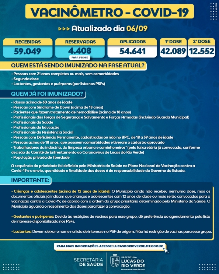 O Município de Lucas do Rio Verde informa a todos os cidadãos que, na atual fase, estão sendo imunizados: