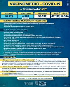 - Em “Transparência”, você pode acompanhar todo o processo de recebimento e destinação de doses do município pelos documentos oficiais do Ministério da Saúde e Governo do Estado de Mato Grosso. No “Vacinômetro”, todas as doses já aplicadas e à quais públicos foram destinados. Demais informações sobre o panorama atual da vacinação contra a Covid-19 em Lucas do Rio Verde, clique em https://www.lucasdorioverde.mt.gov.br/site/coronavirus