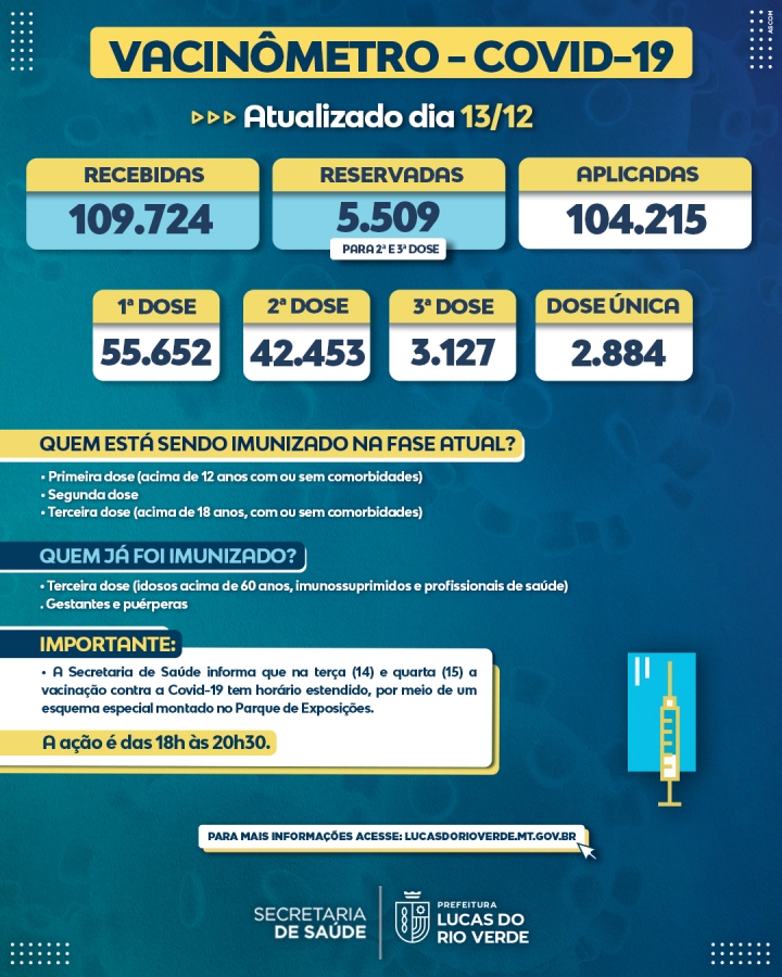 Pessoas com qualquer idade acima de 12 anos devem fazer o agendamento no site da prefeitura (https://vacinalucas.lucasdorioverde.mt.gov.br/#/) e tomar a vacina entre os dias 13 e 17 de dezembro no PSF e horário agendados, ou comparecer no Parque de Exposições nos dias 14 e 15, das 18h às 20h30, sem a necessidade de agendamento.