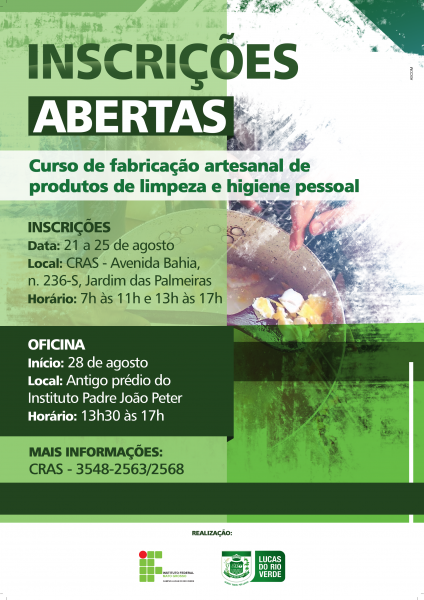 A Secretaria Municipal de Assistência Social e Habitação, por meio do Centro de Referência de Assistência Social (Cras), vai ofertar um curso de fabricação artesanal de produtos de limpeza e higiene pessoal. O curso será realizado em parceria com o Instituto Federal de Mato Grosso (IFMT).