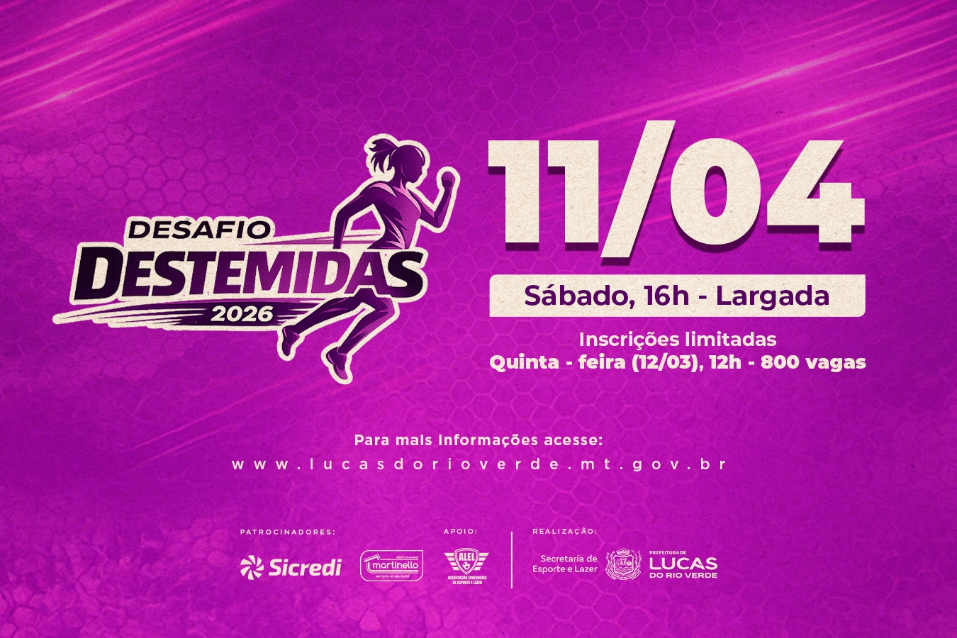 O Desafio das Destemidas é voltado para atletas do sexo feminino, com idade a partir de 16 anos, residentes em Lucas do Rio Verde. O valor da inscrição é de R$ 60,00.
