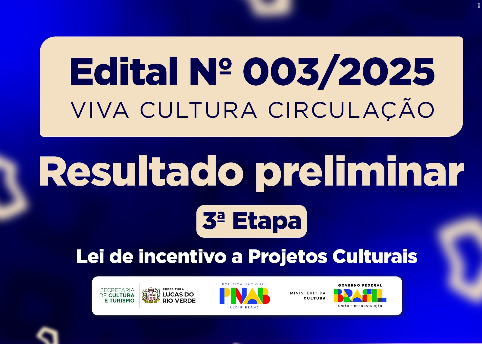 A Secretaria Municipal de Cultura de Lucas do Rio Verde informa que foi publicado, nesta terça-feira (3), o resultado preliminar da 3ª fase do Edital nº 003/2025, referente à etapa de habilitação documental. A lista está disponível em anexo no final da matéria. O resultado final será publicado no dia 11 de junho.