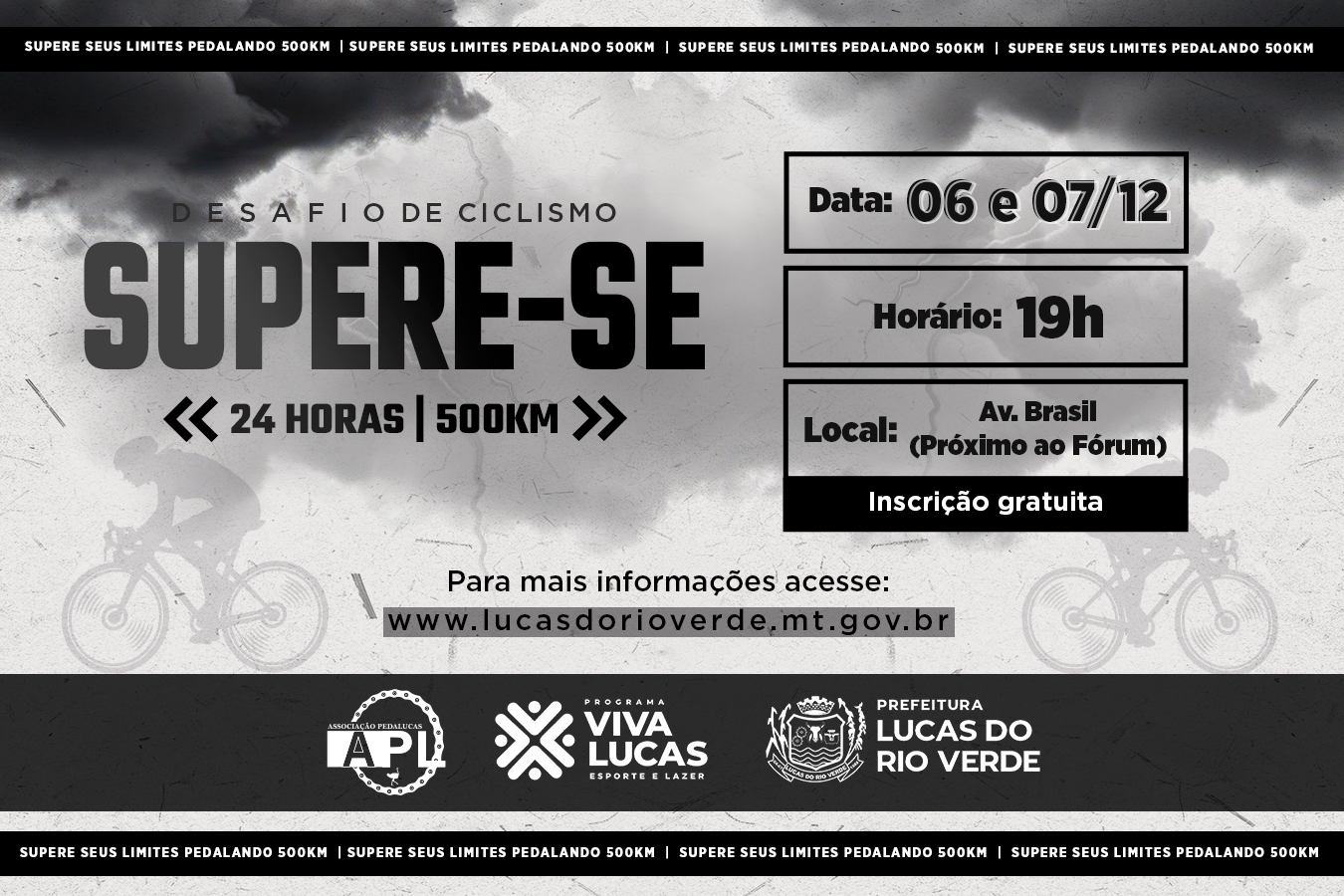 Estão abertas as inscrições para o “Desafio de Ciclismo Supere-se”, evento esportivo que acontecerá em Lucas do Rio Verde nos dias 06 e 07 de dezembro e contará com um percurso de 20 a 500 quilômetros. As inscrições estão abertas e as vagas são limitadas.