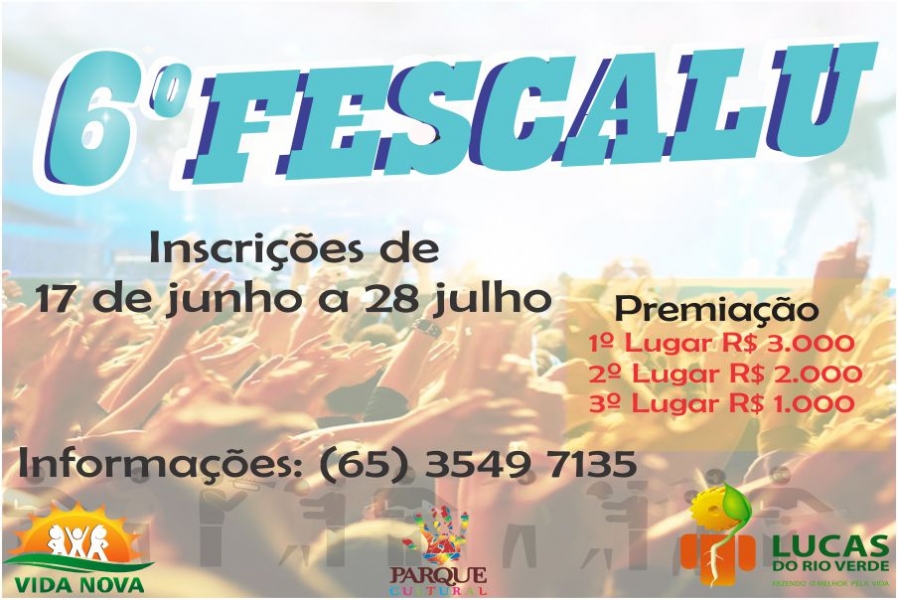 As inscrições para participar do 6º Festival da Canção de Lucas do Rio Verde (Fescalu) foram prorrogadas até o dia 28 de julho. O festival compõe um concurso de músicas inéditas que selecionará as três melhores composições.