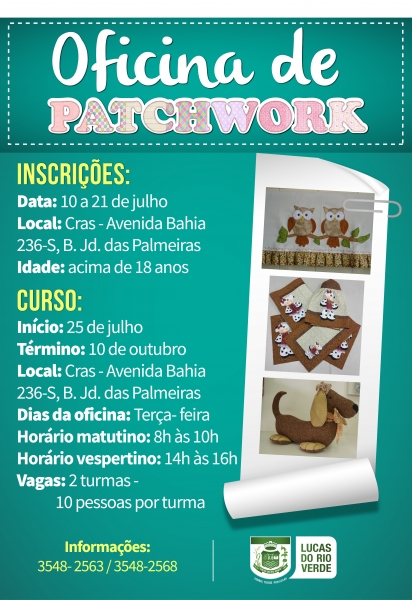 A Secretaria Municipal de Assistência Social e Habitação, por meio do Centro de Referência de Assistência Social (Cras), vai ofertar uma Oficina de Patchwork.