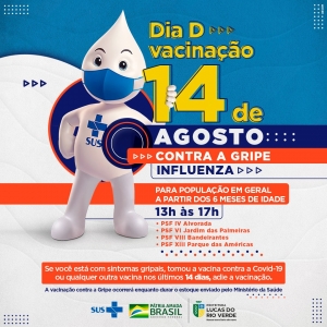 A Prefeitura de Lucas do Rio Verde realizará neste sábado (14) um Dia D de vacinação contra a Gripe (Influenza). A ação será nos PSFs IV Alvorada, VI Jardim das Palmeiras, VIII Bandeirantes e XIII Parque das Américas, das 13h às 17h.