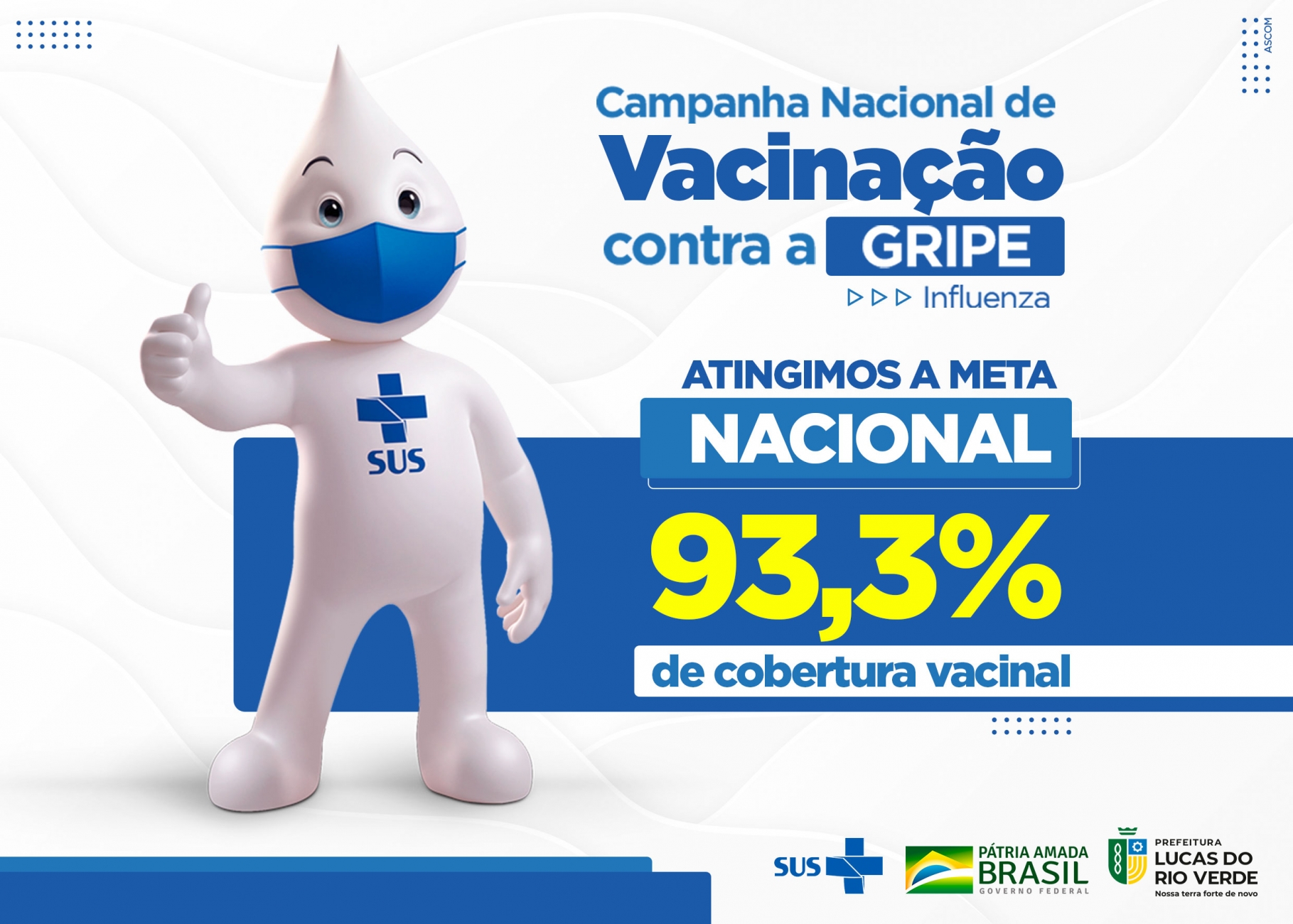 O saldo da vacinação contra a Gripe (Influenza) foi positivo em Lucas do Rio Verde. Com cobertura vacinal de 93,3%, o Município superou a meta nacional do Ministério da Saúde que propõe 90% das pessoas imunizadas. A campanha teve início em 14 de abril em todos os PSFs e, até o encerramento, em 31 de agosto, imunizou 20.514 pessoas.