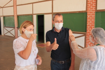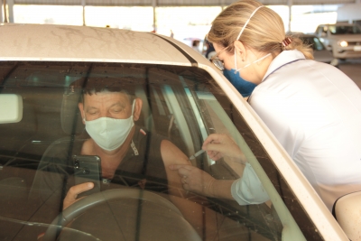 Durante a manhã, o prefeito Miguel Vaz também entrou na fila do drive-thru para receber a imunização.