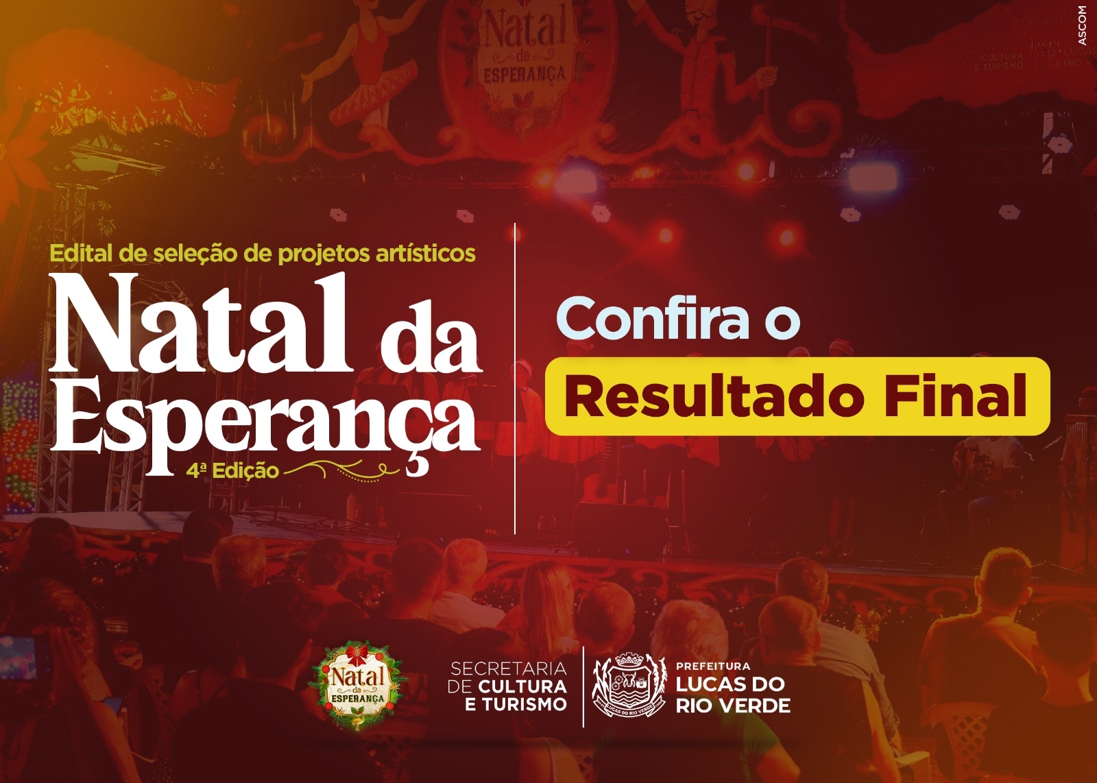 A Secretaria de Cultura e Turismo de Lucas do Rio Verde divulgou, nesta segunda-feira (18), o resultado final do edital 008/2024, voltado à seleção de projetos culturais e produtores locais que integrarão a programação da 4ª edição do Natal da Esperança.