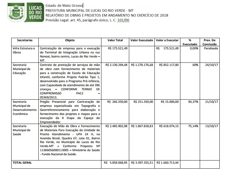 De acordo com as determinações da Lei de Diretrizes Orçamentárias (LDO), em 2018, serão investidos de R$ 1,6 milhão para andamento das ações de infraestrutura e obras envolvendo diversas secretarias, totalizando investimentos de cerca de R$ 5 milhões.