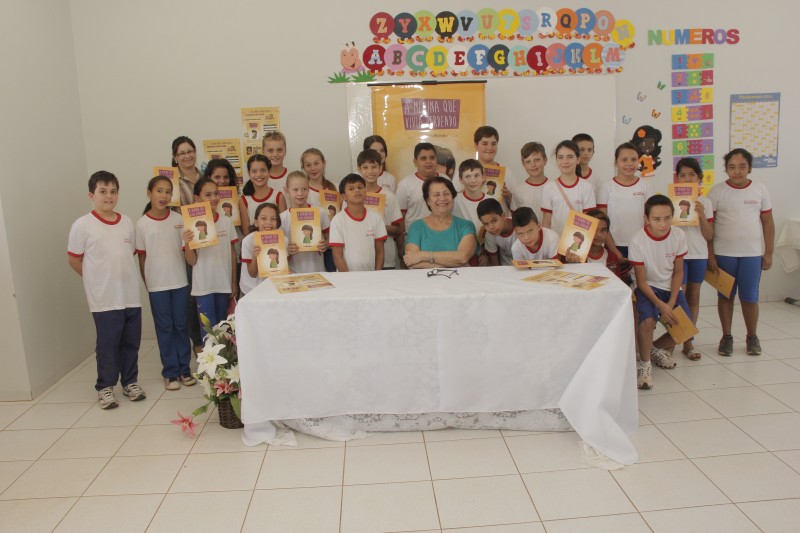 Durante a manhã, a escritora participou de um momento de autógrafos com os alunos da Escola Municipal Vinicius de Moraes.