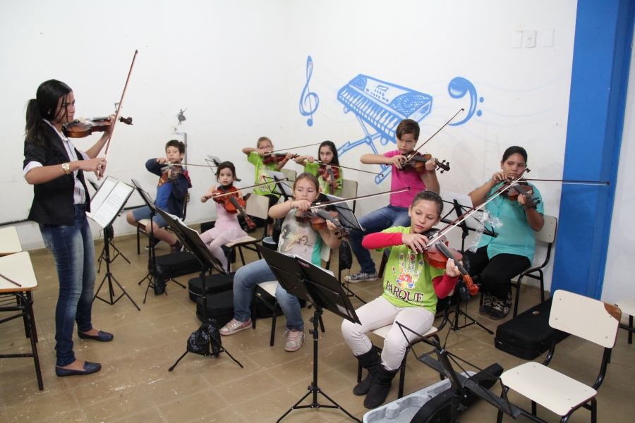 Algumas das oficinas de instrumentos musicais fazem parte da Orquestra Sinfônica Jovem de Lucas do Rio Verde. O projeto tem o objetivo de transformar a vida de crianças e adolescentes por meio da música.