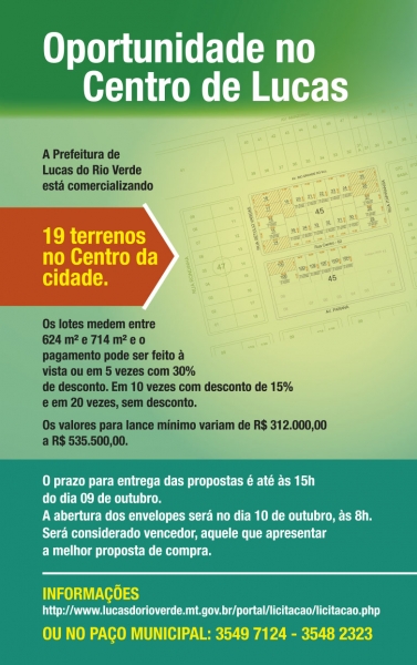 A Prefeitura de Lucas do Rio Verde está comercializando 19 terrenos urbanos no Centro da cidade. A venda está sendo realizada por meio da concorrência pública n. 006/2017.