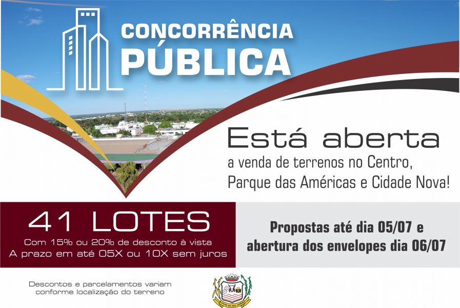 O prazo para entrega dos envelopes é 05 de julho e a abertura será no dia 06 de julho. Vence a concorrência, aquele que oferecer a melhor proposta de compra. Mais informações no edital ou no Departamento de Licitações da prefeitura.