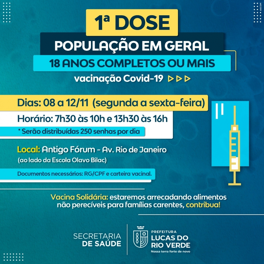 A Prefeitura de Lucas do Rio Verde convoca pessoas com 18 ANOS COMPLETOS OU MAIS que, por algum motivo, não tiveram a oportunidade de se vacinar contra a Covid-19, para comparecer à continuação da repescagem, ou seja, uma nova convocação de primeira dose.