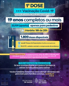 Lucas do Rio Verde convoca para PRIMEIRA DOSE pessoas de 19 anos completos ou mais para a vacinação contra a Covid-19. A ação será nesta quarta-feira (22), das 18h às 20 horas, no Parque de Exposição (Pavilhão da Expolucas), com acesso apenas para pedestres.
