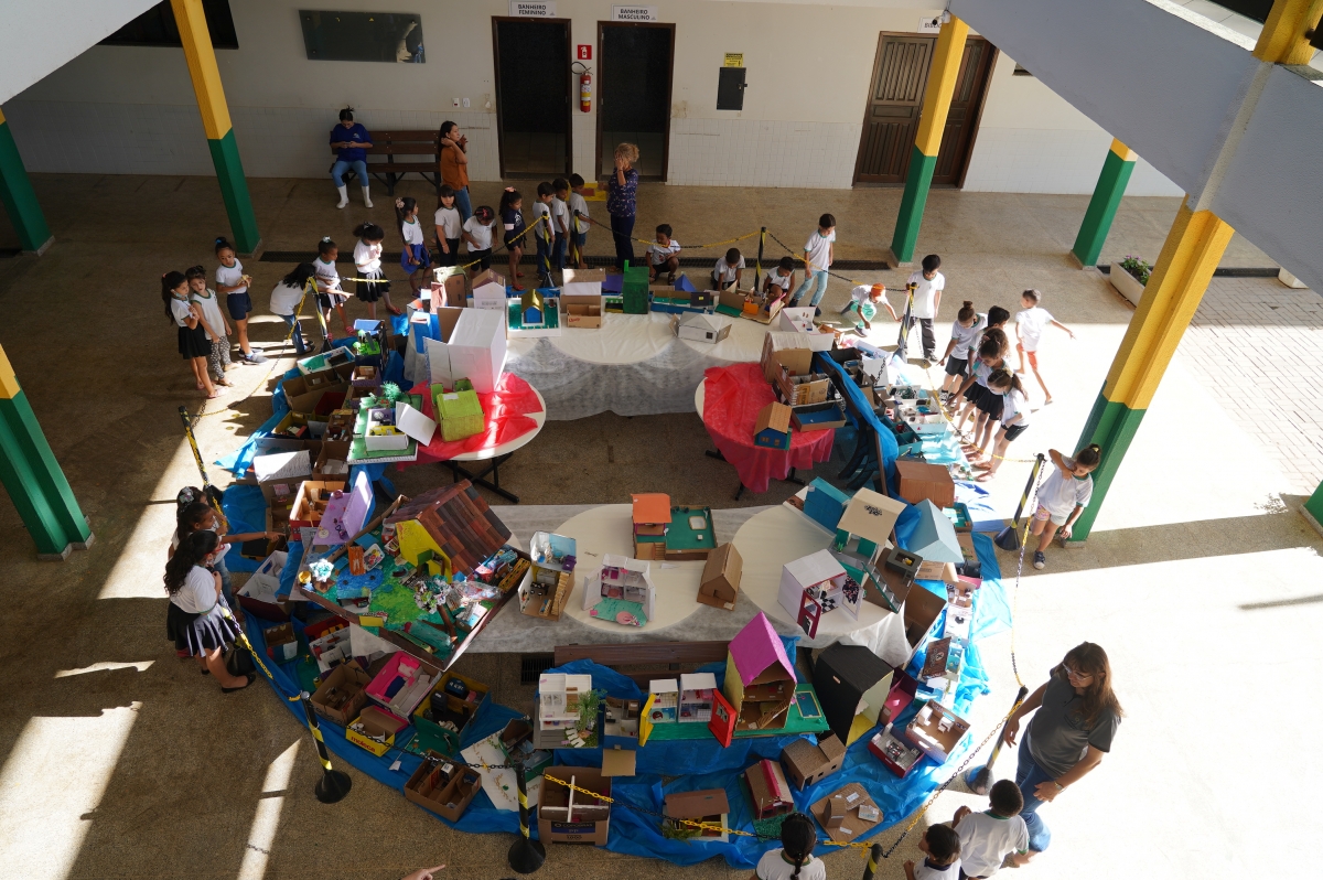Paredes de papelão, escada de palitos e caixinhas de fósforo como móveis foram alguns dos itens usados pelas crianças da Escola Municipal Cecília Meireles, no Tessele Junior, para a construção das houses, a vila de casas feita com materiais recicláveis, idealizadas pela professora de inglês do ensino fundamental, Jane Lemos, para o aprendizado da língua. As casinhas foram expostas para a atividade nesta terça-feira (05).