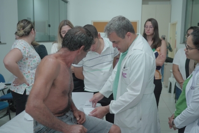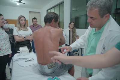 Já a parte prática do curso foi realizada somente para os profissionais que concluíram a parte teórica. Durante o encontro presencial, os profissionais realizaram atividades práticas vivenciadas no conteúdo teórico a fim de proporcionar a melhor fixação do conhecimento adquirido. Essa etapa contou com a presença de pacientes com hanseníase e seus contactantes, para que eles pudessem ser diagnosticados durante o treinamento. Na ocasião, também foi possível diagnosticar pacientes que estivessem com a doença há mais de 2 anos, a fim de pesquisar resistências.