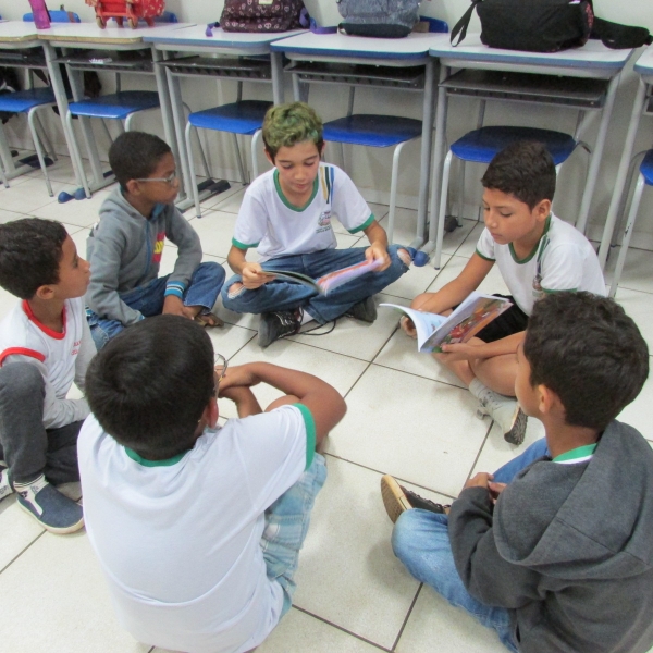 Na tarde de ontem (03), os alunos dos 1º anos, das professoras Quélita Quintanilha e Iracema Jaqueline Lopes, interagiram com a turma do 5º ano. Durante a ação, os estudantes se colocaram no lugar do professor e fizeram leituras para os alunos menores.