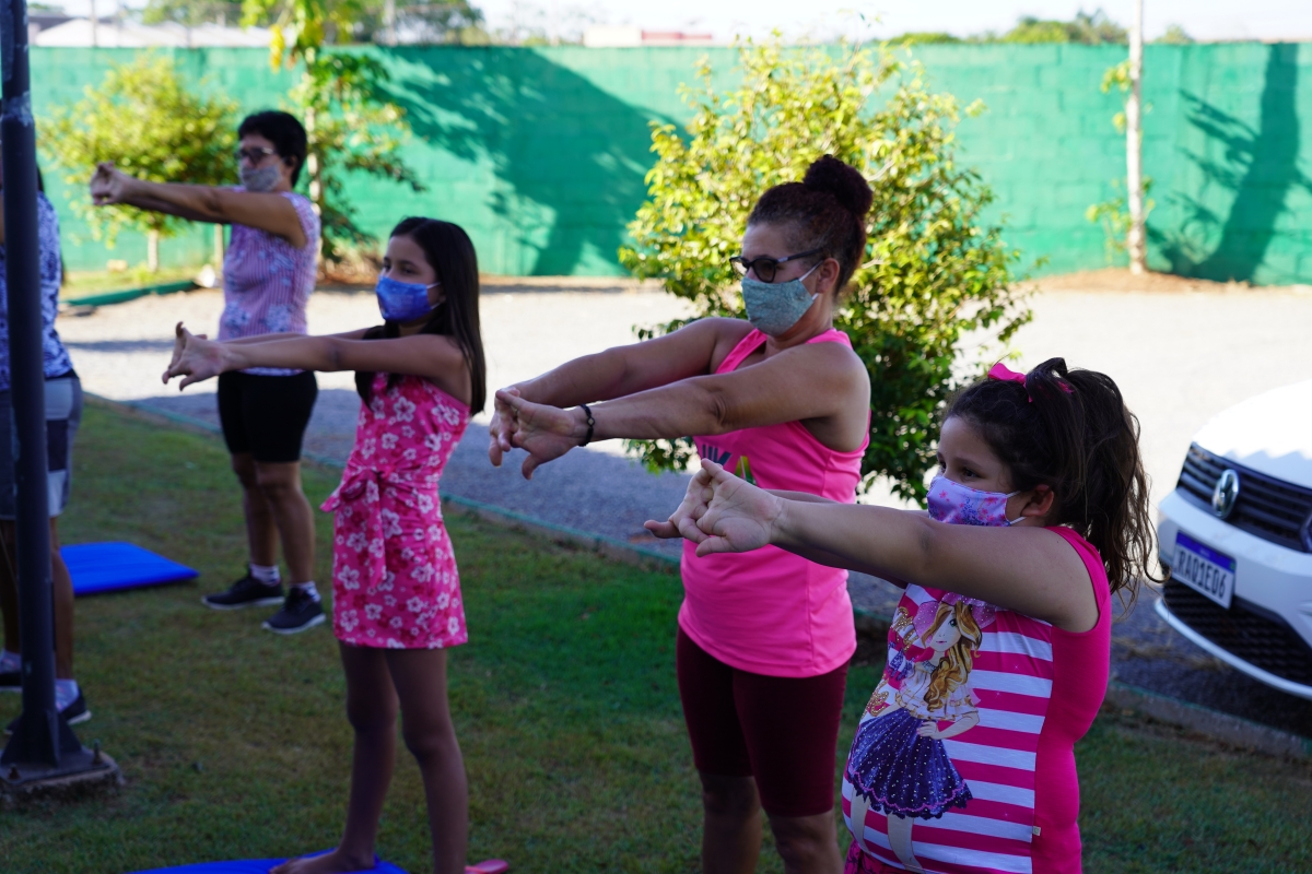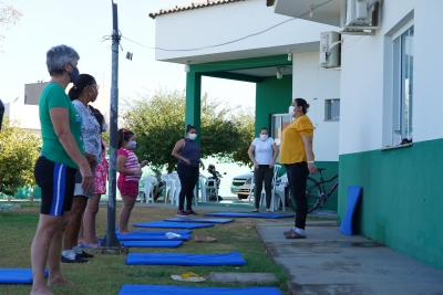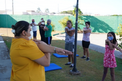 A retomada do grupo de alongamento segue com todos os protocolos de segurança necessários para o enfrentamento da pandemia, como uso de máscara, álcool 70% e o distanciamento.