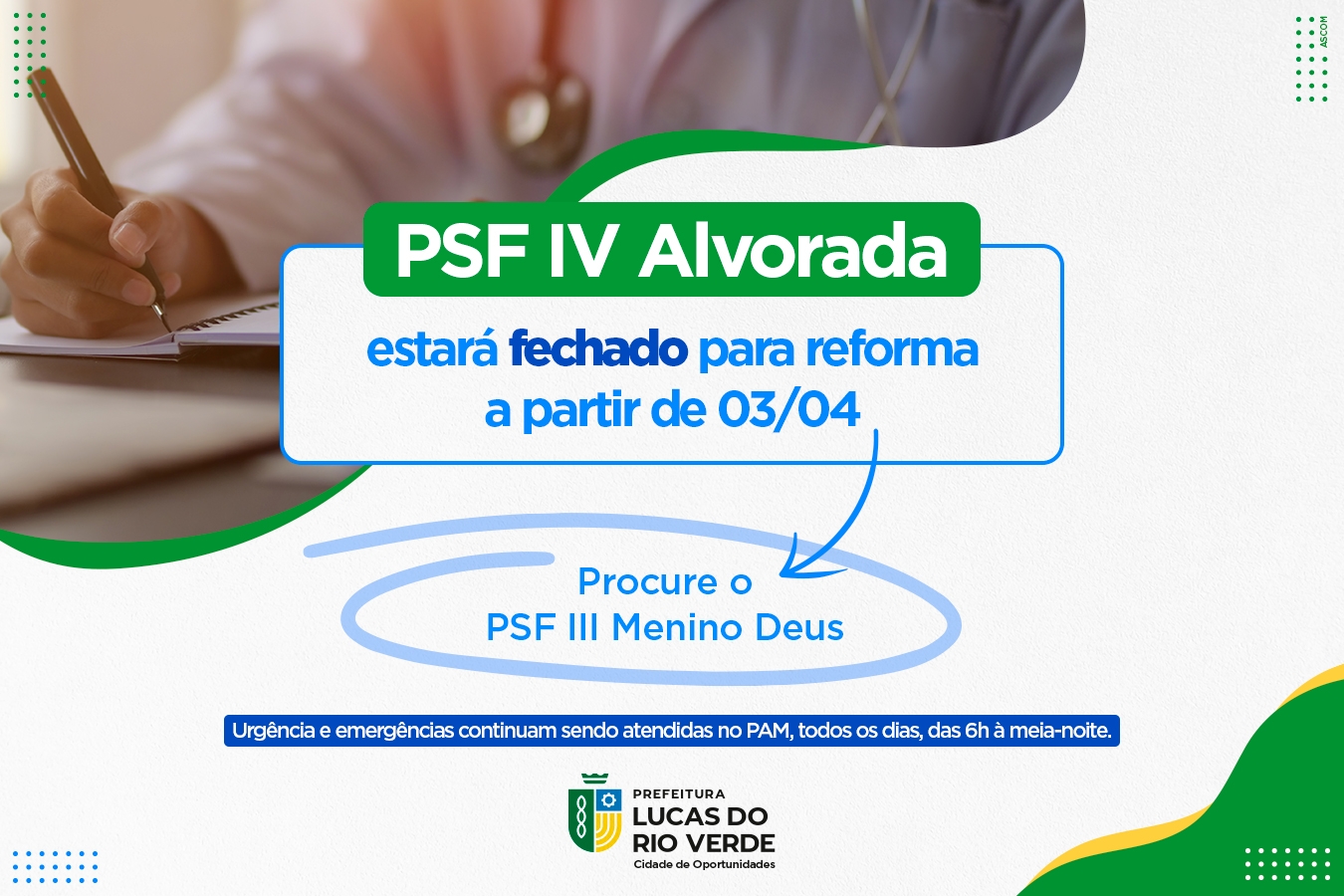A Prefeitura de Lucas do Rio Verde informa aos moradores do bairro Alvorada, que são atendidos no PSF IV Alvorada, que a unidade estará fechada para manutenção a partir do dia (3) de abril. A unidade atende anualmente, em média, 3 mil pacientes e realiza mais de 6 mil consultas.