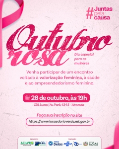 Em Lucas do Rio Verde o Outubro Rosa vai ganhar um significado especial neste ano. No dia 28 de outubro, às 19h, o Sebrae e a Prefeitura de Lucas do Rio Verde, por meio da Secretaria Municipal de Assistência Social e Habitação, realizam o evento ‘Autocuidado não é luxo, é estratégia de negócios’, na sede da CDL Lucas.