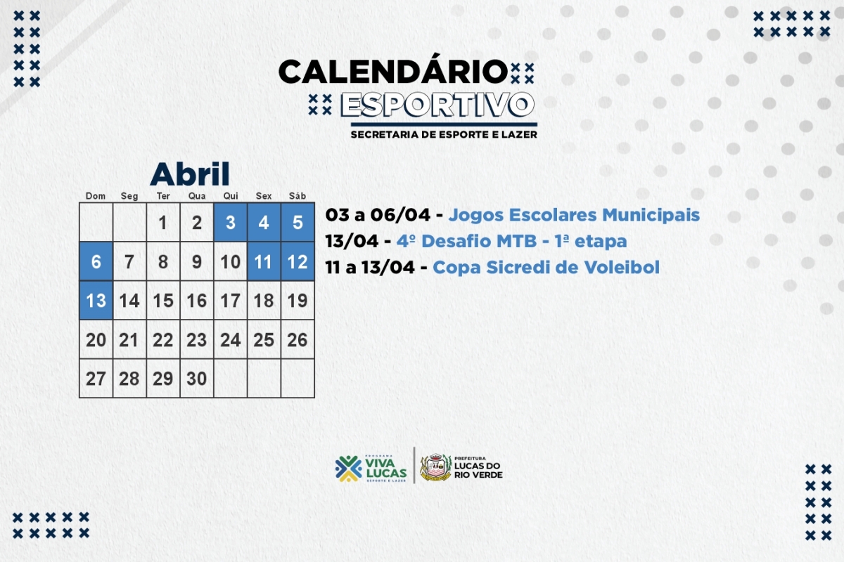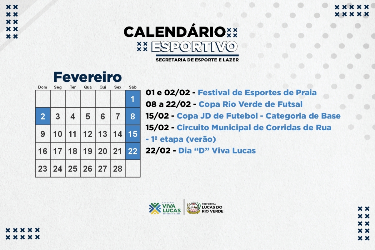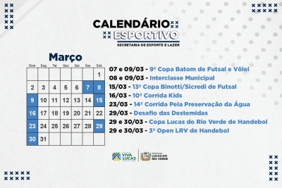Nesta quarta-feira (15), a Prefeitura de Lucas do Rio Verde, por meio da Secretaria de Esporte e Lazer, divulgou o calendário esportivo para o primeiro trimestre do ano. As atividades iniciam em fevereiro com o Festival de Esportes de Praia.