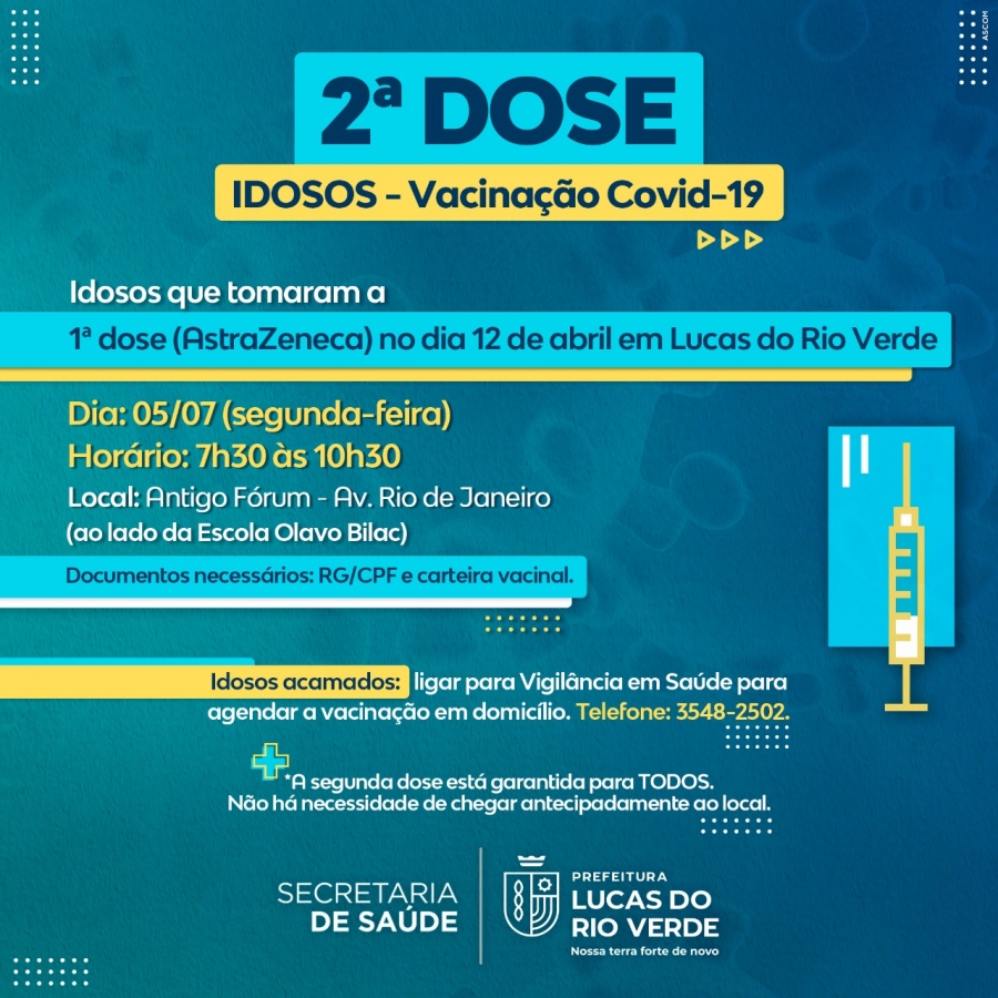 A Secretaria de Saúde de Lucas do Rio Verde informa sobre a vacinação de segunda dose contra a Covid-19 para os IDOSOS de 70 anos que receberam a PRIMEIRA DOSE da marca AstraZeneca no dia 12 de abril (na Vigilância em Saúde).