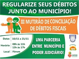 Semana da Conciliação em parceria com o Judiciário de Mato Grosso teve início no dia 10 e os levantamentos de débitos de impostos municipais é feito no Fórum de Lucas do Rio Verde. A Campanha é válida para quem tem dívidas do Imposto Predial e Territorial Urbano (IPTU), Contribuição de Melhorias (asfalto) e Imposto Sobre Serviço de Qualquer Natureza (ISSQN).