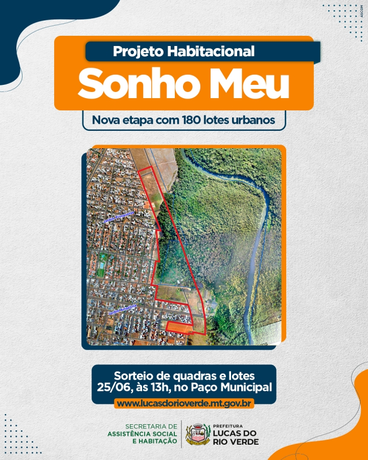 A Prefeitura de Lucas do Rio Verde, por meio da Secretaria de Assistência Social e Habitação, informa que realizará o sorteio de quadras e lotes da segunda etapa do Projeto Habitacional Sonho Meu. O sorteio será nesta terça-feira (25), às 13h, no Auditório dos Pioneiros - Paço Municipal, com os 180 nomes da lista de classificados para o habitacional.