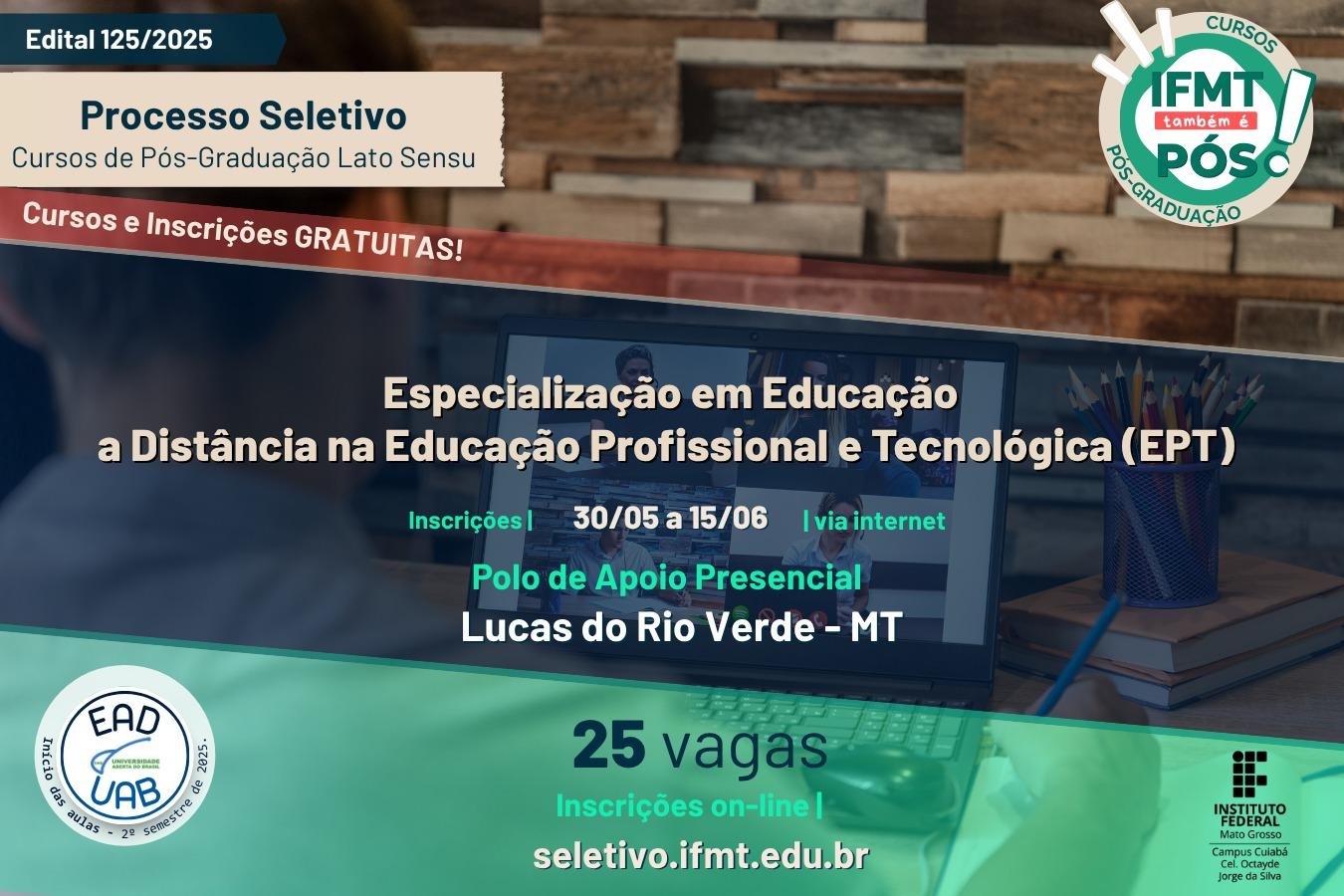 A Universidade Aberta do Brasil (UAB), polo de Lucas do Rio Verde, está com inscrições abertas para o curso de pós-graduação, em nível de especialização, de Educação a Distância na Educação Profissional e Tecnológica (EPT). O curso, ofertado pelo Instituto Federal de Educação, Ciência e Tecnologia do Mato Grosso (IFMT), é gratuito e será realizado na modalidade a distância.