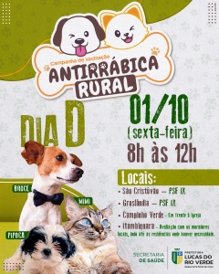 A Secretaria de Saúde de Lucas do Rio Verde informa a população, especialmente os moradores das áreas rurais, que na próxima sexta-feira (01), das 8h às 12h, a Vigilância Sanitária fará a vacinação de cães e gatos contra a raiva nas comunidades.