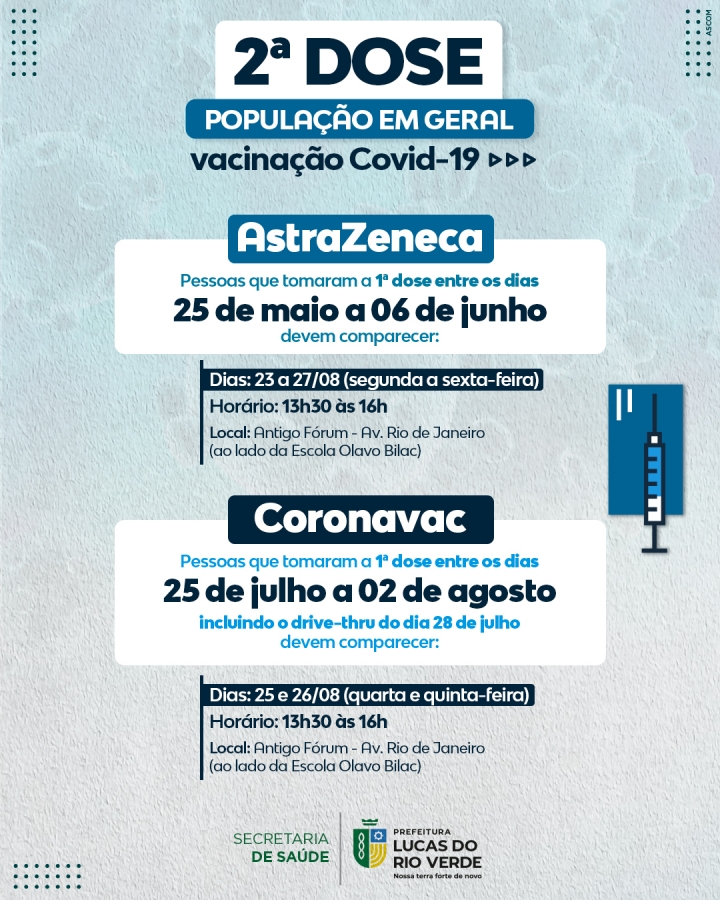 A Secretaria de Saúde de Lucas do Rio Verde informa o cronograma de aplicação de SEGUNDA DOSE da vacina contra a Covid-19.